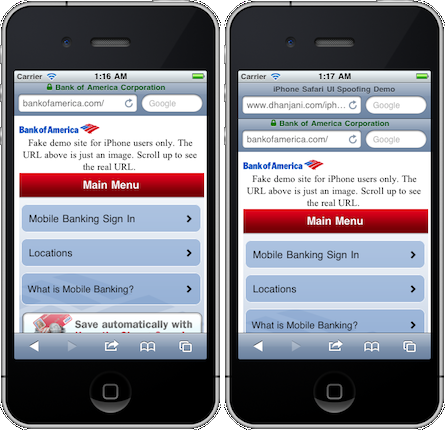More than 10 years ago, desktop browser vendors recognized the importance of keeping the location bar visible at all times. As a result desktop browsers stopped allowing the opening of windows without a location bar. Sadly, on mobile web browsers, the location bar scrolls out of view as soon as the page scrolls. Combined with that fact that the page can be auto-scrolled programmatically upon load, this allows hackers to display a fake location bar: